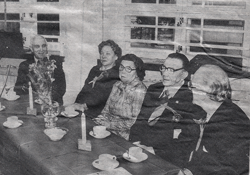 Kuva seuran 50-vuotisjuhlista 26.12.1978. Seuran perustajäseniä kuvassa vasemmalta: Leevi Joki, Taimi Joki, Stiina Joensuu, Arvo Nordlund ja Taisto Simula.
