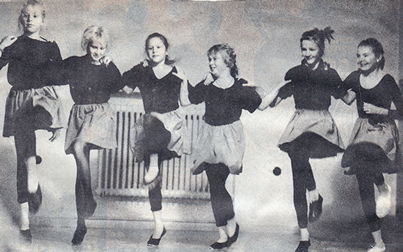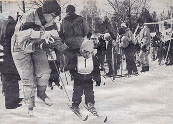 Kuva hiihtokilpailuista 20.3.1988, kisoihin osallistui 70 lasta. Oikeassa kuvassa Mäkin tyttöjen tanssiesitys 60-vuotisjuhlassa 18.12.1988