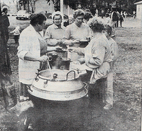 Kuva siikajuhlista, vasemmassa kuvassa Raili Sulameri annostelemassa siikasoppaa. Oikeassa kuvassa veljekset Riku ja Juho Sulin pallonheitossa.